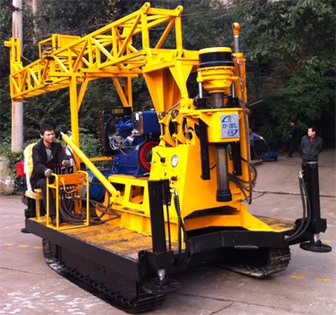 钻机包括履带底盘、柴油机和钻井主体,所有这些部件将安装在一个机架上。柴油机驱动钻机、液压油泵和履带底盘,动力通过分动器传递给钻机和履带底盘。